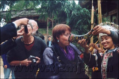 酿制的酒中,质量最高要数“重阳酒”为传统的窖酒。其制作很讲究,系用上好的糯米蒸熟作母子发酵成甜酒,另酿制度数最高的头道酒掺入甜酒中去泡,便成酒性纯正,酒色泽棕黄,状若稀释的蜂蜜,香味馥郁、青甜爽口。若窖在地里,时间越长,酒性更为纯正,苗族人民秉性豪爽,热情好客,酒在他们的心目中,是待亲朋的佳品和桥梁,每逢客至,常用自酿村醪,以飨宾朋。他们感到无酒不成礼仪,菜肴即使丰盛,无酒主人则感到怠慢了客,不成敬意。俗语说:“酒吃人情肉吃味”,重酒不重菜,只要有酒即使只有酸汤菜或一碟辣椒水都行。客人喝口寡酒下肚也是满意而归。酒席间,主人殷勤劝酒,当客人接过酒碗毫不犹豫地一饮而尽时,主人便喜笑颜开,热情地跟你攀谈,若客人不饮或饮之不力,主人会豁然不快,总之,来客必有酒待为贵,因而苗族人民创造发明了牛角酒、栏路酒、双脚走路酒、团圆酒、祝颂酒、交怀酒、送别酒等等独特的饮酒礼节。长辈、客人先饮是通常的礼节,交怀对饮,换盏添兴是一般规矩,劝酒时,常引吭高歌助兴,抒发彼此间的感情,或叙述族源、史实、歌唱丰收等等,有呼有应,有领有合,唱一首,对一曲,谁唱输谁就喝上一碗,彻夜不眠,通霄达旦。