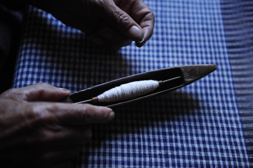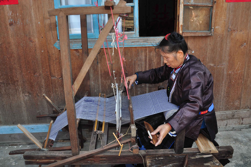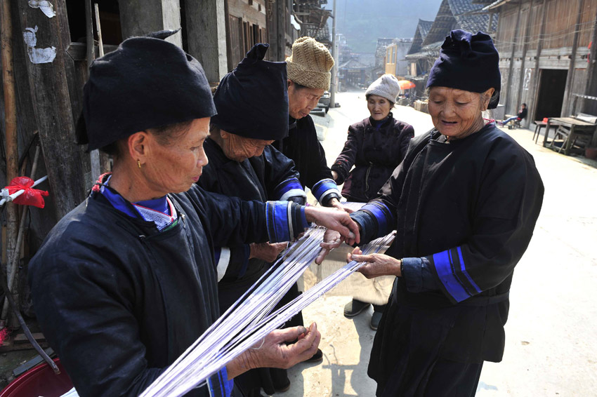 在贵州省黎平县铜关村,侗族老人在梳理纱线。