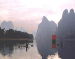 漓江两岸的山峰伟岸挺拔,形态万千,石峰上多长有茸茸的灌木和小花,远远看去,若美女身上的衣衫。江岸的堤坝上,终年碧绿的凤尾竹,似少女的裙裾,随风摇曳,婀娜多姿。最可爱是山峰倒影,几分朦胧,几分清晰。江面渔舟几点,红帆数页,从山峰倒影的画面上流过,真有“船在青山顶上行”的意境。百里漓江的每一处景致,都是一幅典型的中国水墨画。