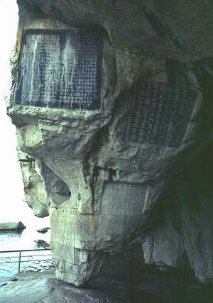 还珠洞里有一块试剑石,传说伏波将军马援南征时过此,运剑将石柱劈断,将军神力,竟然如斯!传说当然只是传说,但马援却的确是个真英雄,他那番关于男儿当建功于边野,马革裹尸以还的名言,和他言出必践的生平,尽显大丈夫的气概,堪与闻鸡起舞,渡江击楫的祖逖,和“知不可为而为之”而北上击胡的悲剧英雄刘琨相比。