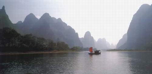 从来都认为乘船在漓江上慢慢漂流才是最有其真趣味的,可惜漓江上往来的机动游船,千篇一律是强迫游客走马观花的。如果为日程宽松的游人安排些人力的木船,象自称“青藤门下走狗”的那位有趣的袁枚袁子才老先生那样,让船在青山顶上缓行,细数江中游鱼,那是多好!
